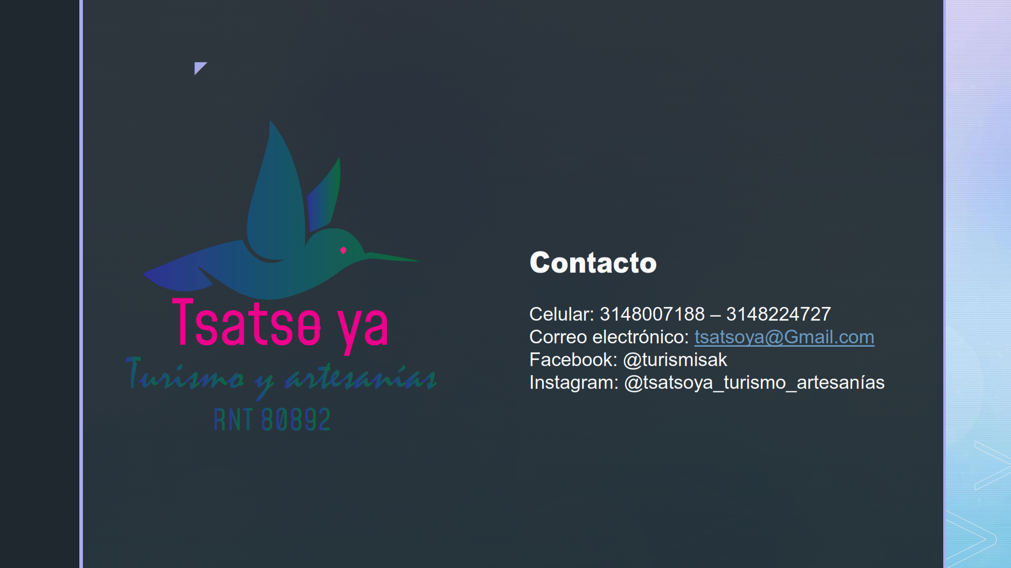 tsatso la casa del colibrí taller artesanal Super UserModa y accesorios Visitas: 2350 Rating: ( 0 Rating )Por favor califiqueVotar 1Votar 2Votar 3Votar 4Votar 5 tsatso la casa del colibrí taller artesanalContactos 3148007188 – 3148224727 Correo: Esta dirección de correo electrónico está protegida contra spambots. Necesita activar JavaScript para visualizarla. Cauca-Colombia++++++++++collares , mochilas , candongas Facebook Twitter AntSiguiente
