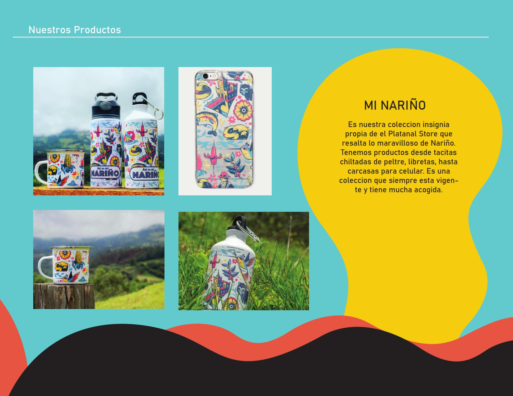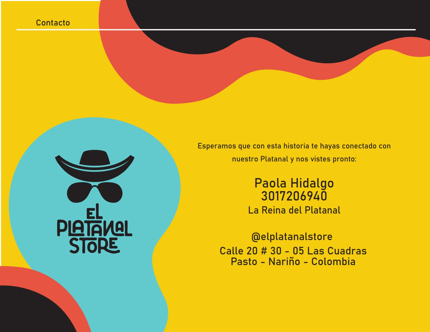 sube y el peso que baja, buscamos crear una alternativa de negocio para mostrar y resaltar el diseño nariñense y colombiano porque es desde nosotros que debemos empezar a valorar y transmitir nuestra cultura. Creemos en el talento, en la creatividad y en las ideas ocultas detrás de una taza de café, en los cuadernos llenos de bocetos, en los sueños y emprendimientos llenos de magia, color y formas. Por tal razón, buscamos abrir espacios de comercialización para resaltar todo el valor de las obras de los diseñadores, ilustradores y artistas de nuestra región. Y porque el Platanal? Es una pregunta frecuente. Estábamos en pleno paro el año pasado 2021 y escuchábamos que algunos decían que se querían largar de este Platanal por falta de oportunidades y se nos ocurrió el nombre para cambiar la idea despectiva de que un platanal es feo si no que es un Platanal lleno de colores, de buena música, de mucha sabrosura tropical y buena onda como lo es nuestra Colombia y todos nuestros productos representan esto.