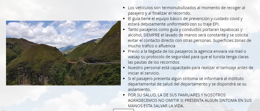 ELa agencia de viajes Valkt Tour, es una agencia especializada en la organización de planes turísticos nacionales e internacionales, turismo receptivo vip, practicas empresariales, turismo religioso, excursiones grado once, grupos tercera edad, solos y solas, luna de miel, tours de quinceañeras, tiquetes aéreos nacionales e internacionales, Viajes con mascotas, comunidad LGBTI, personalización de planes de acuerdo a solicitud y requerimiento del cliente. VALKT TOUR AGENCIA DE VIAJES OPERADORA, Calle 17 # 24 80 C.C. SANTA FE OF 206 Contactos, 3168359399, Email, Esta dirección de correo electrónico está protegida contra spambots. Necesita activar JavaScript para visualizarla. Pasto-Nariño-Colombia